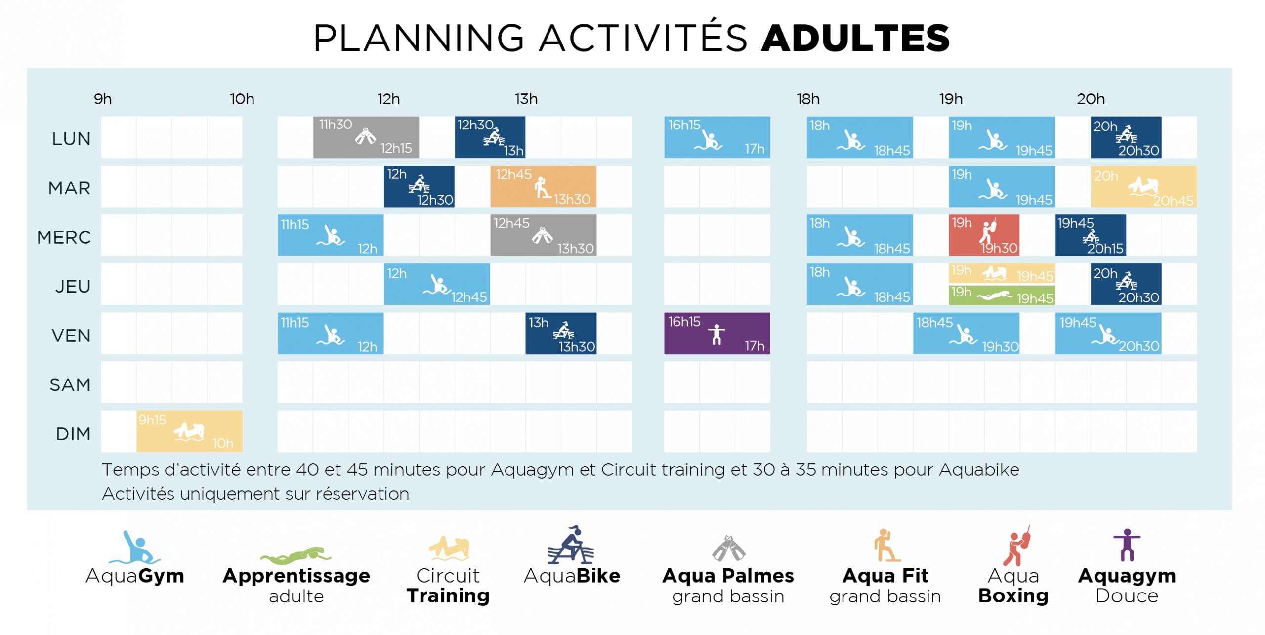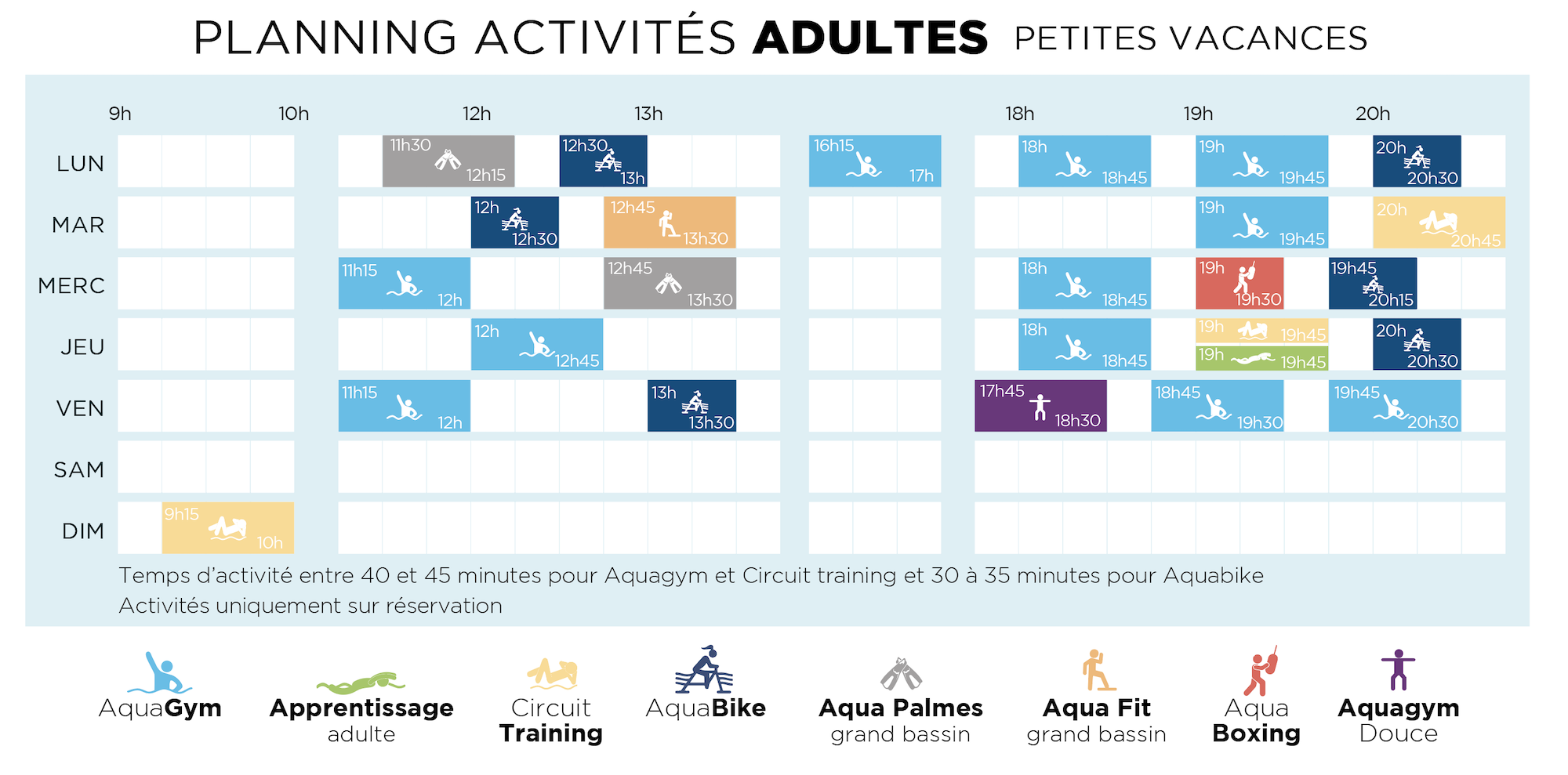 PLANNING ACTIVITÉS Télécharger le planning école de natation Télécharger le planning activités adultes Télécharger le planning activités adultes petites vacances ACTIVITÉS ADULTES APPRENTISSAGE AQUABIKE AQUAGYM CIRCUIT TRAINING AQUA PALMES AQUA BOXING AQUA FIT AQUAGYM DOUCE ACTIVITÉS ENFANTS BB & Cie CIRCUIT KID AQUASAFE ACADÉMIE DES KIDS CAP BLEU CAP BLANC CAP ROUGE